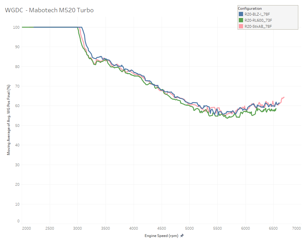 The turbocharger wastegate duty cycle (WGDC) is also very similar for each intake. The slight decrease in the R600 case could be due to the lower ambient air temperature.