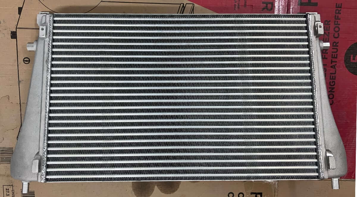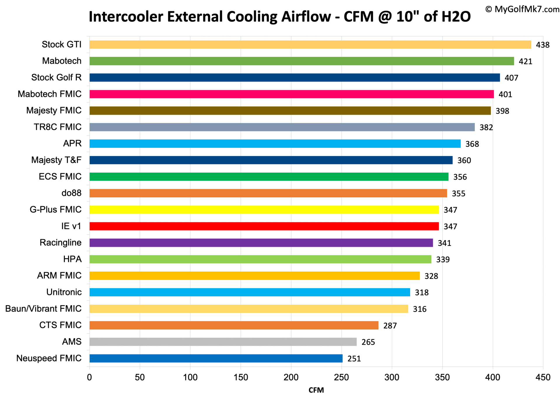 The Majesty competition intercooler is a stock-location tube-and-fin design IC for the Mk7 GTI. In general, tube-and-fin cores have exhibited lower pressure drop than most bar-and-plate styles I have tested.