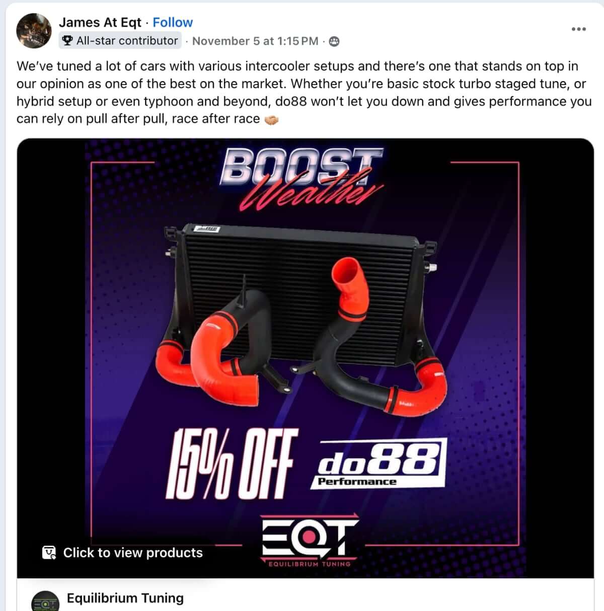 The following advertisement is for an intercooler resold by Equilibrium Tuning, from the manufacturer do88.