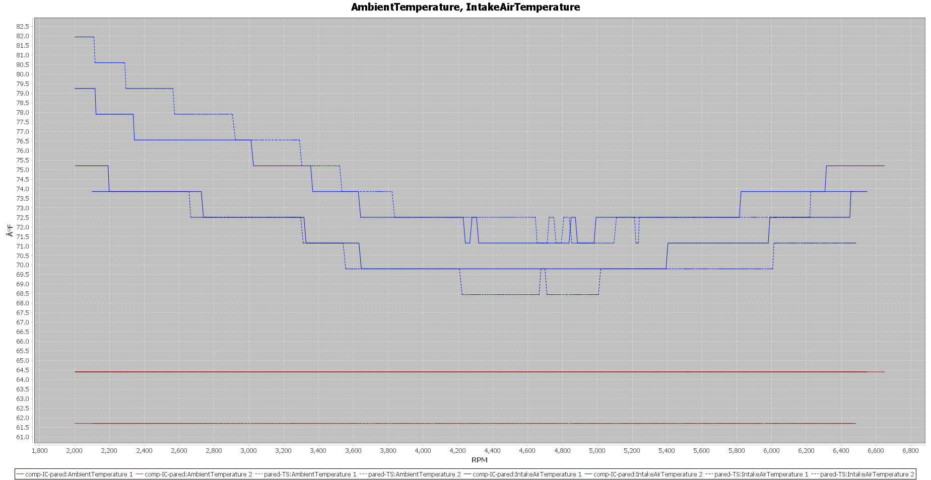 The intake air temperature (IAT) above ambient at 6,000 RPM is shown for the two pulls using the Majesty Competition IC and the Majesty FMIC.