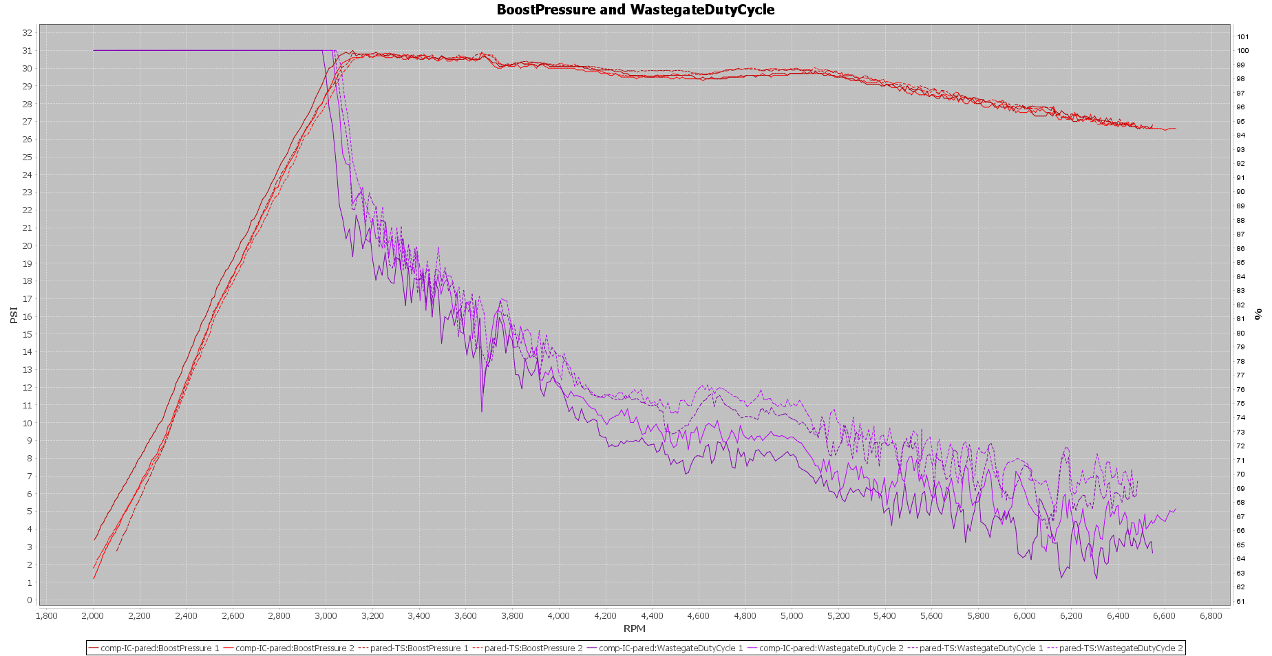 Boost pressure is the same across both setups, but the lower-pressure-drop Competition IC setup has a slightly lower wastegate duty cycle (WGDC).