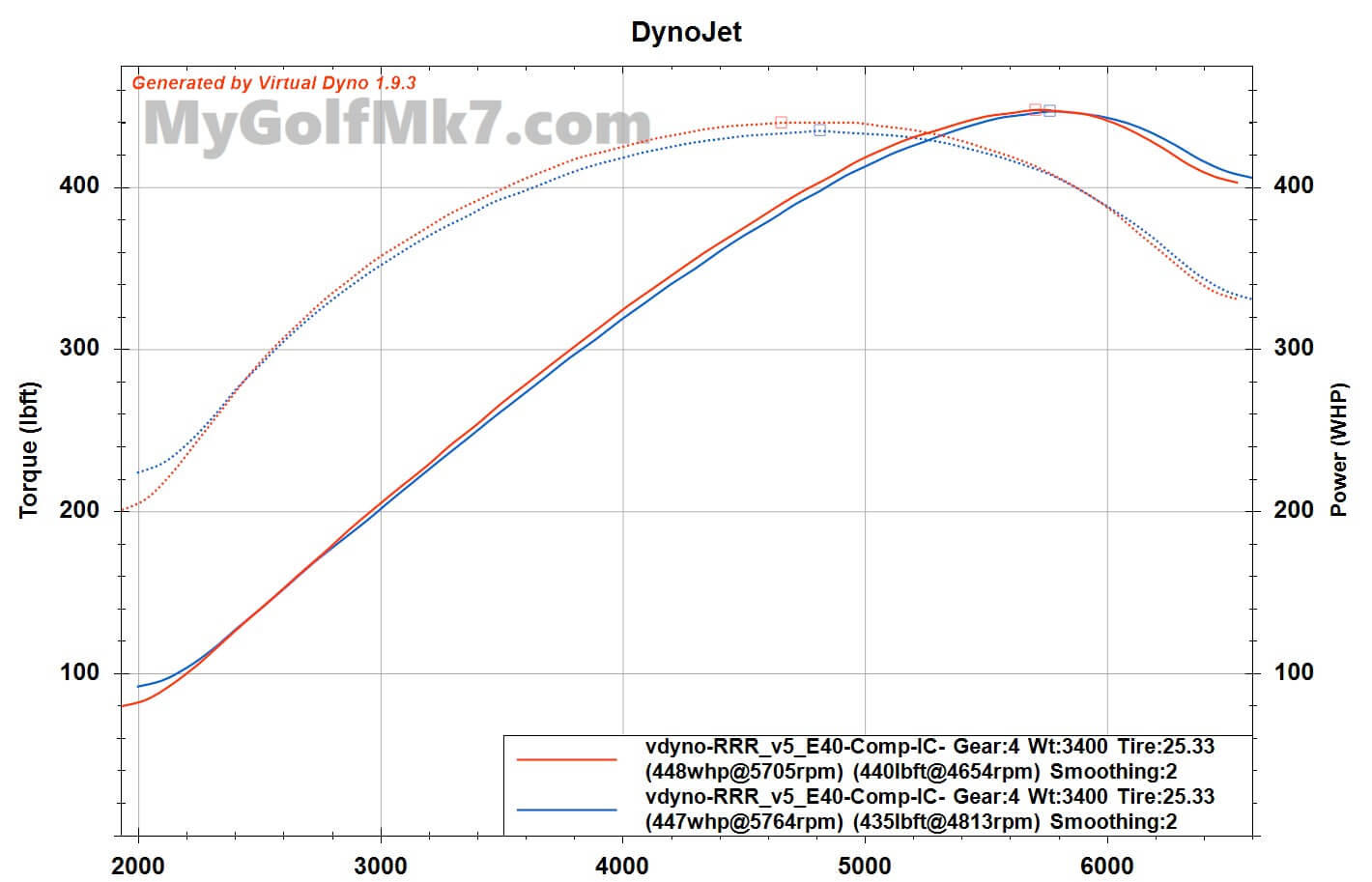 Data was recorded using a Shuenk IS48 turbocharger with a Russell Road and Racing E40 ECU tune. Two full-throttle pulls in fourth gear are made.