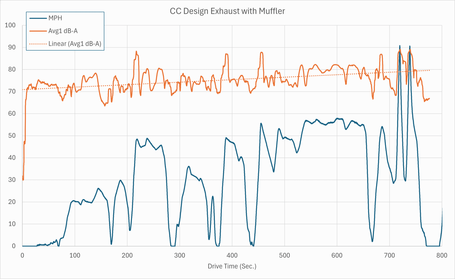 The next chart includes the CC Design exhaust with the straight pipe, still showing the sound level over the drive duration.