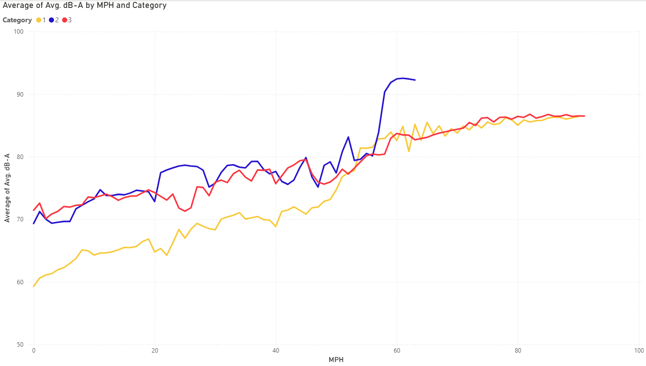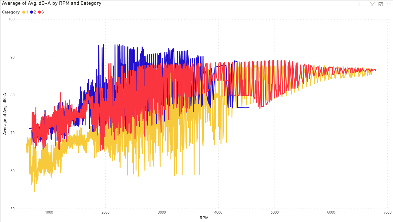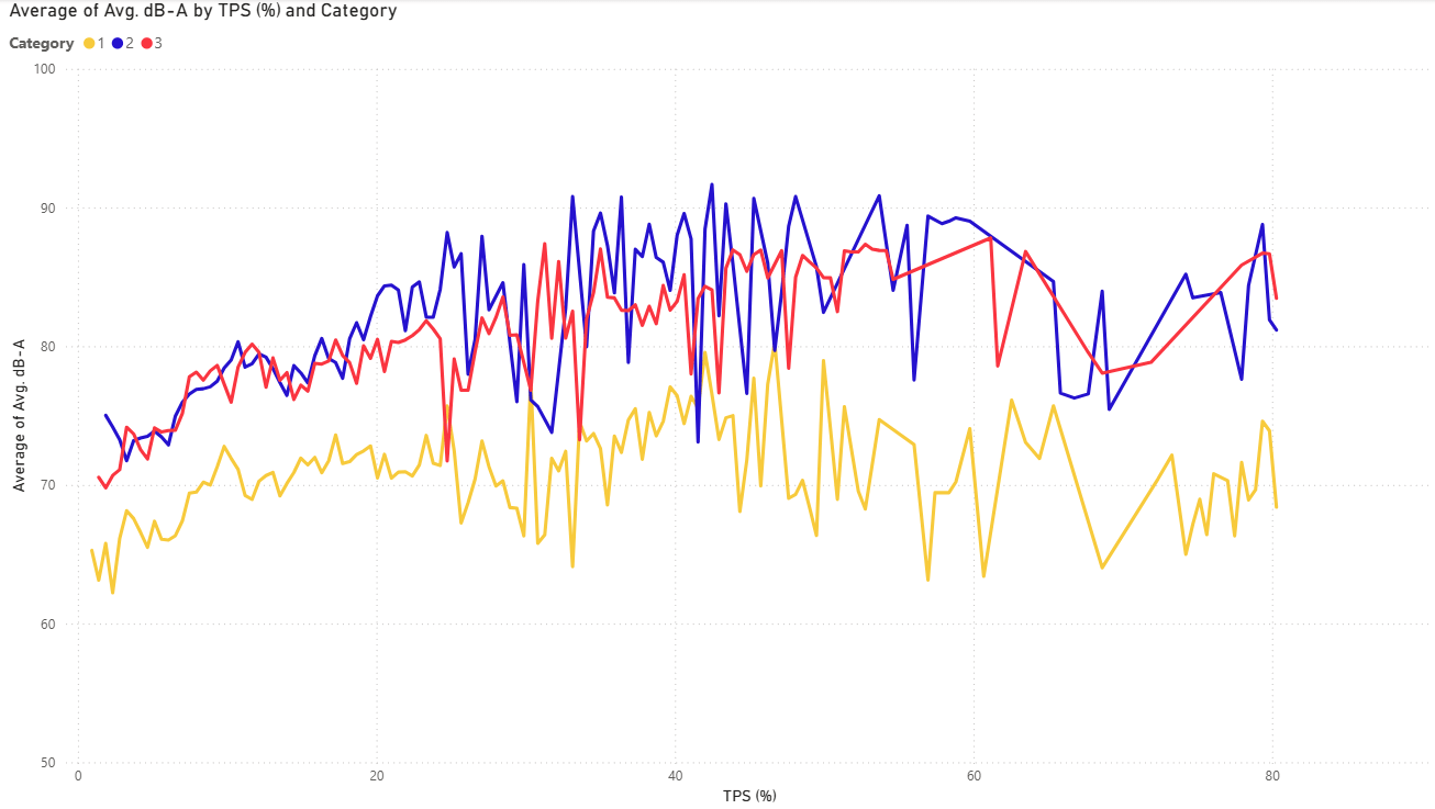 The following charts show how sound levels across the different setups vary with factors such as engine speed, vehicle speed, throttle position, etc.