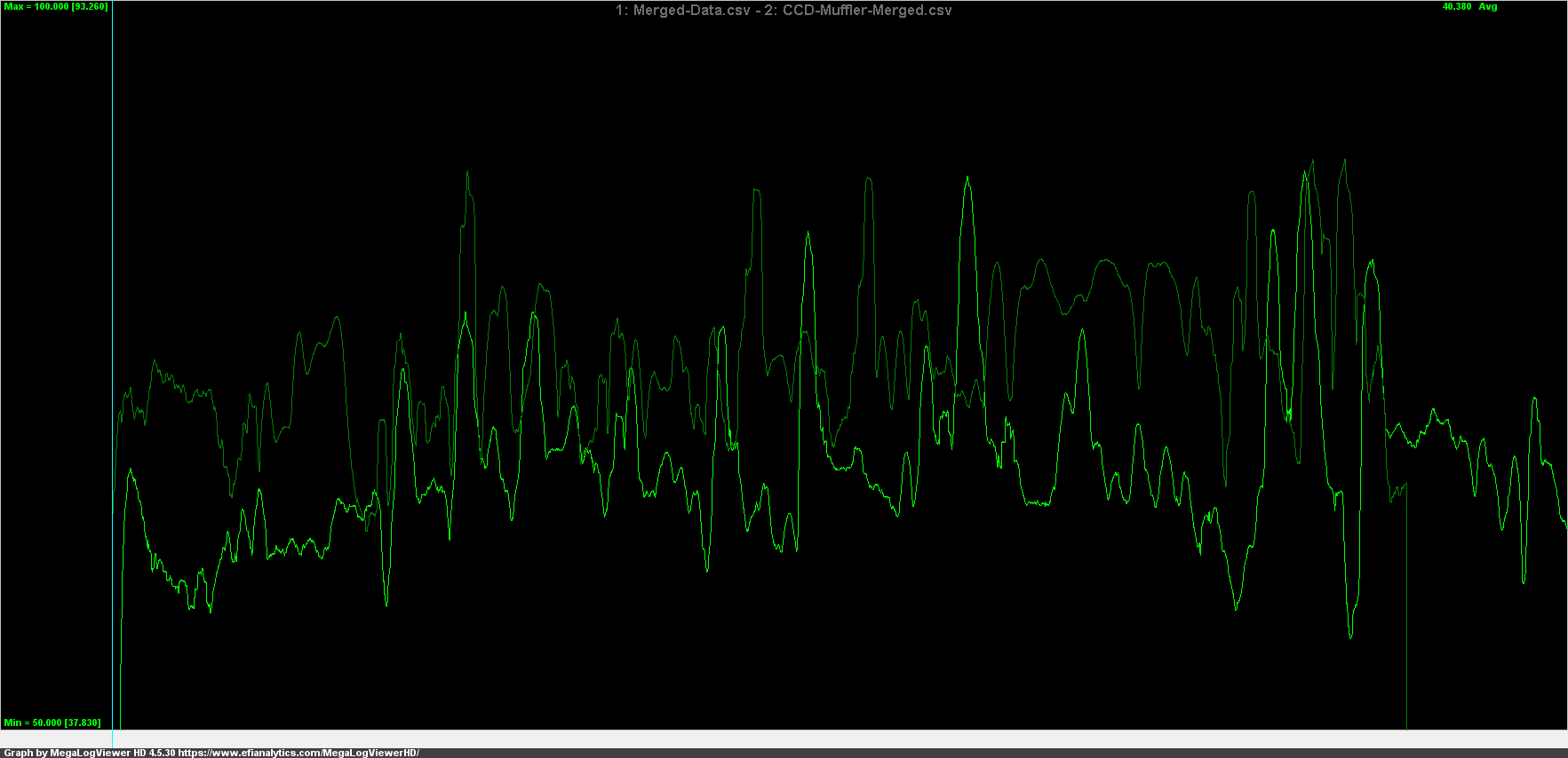 The sound levels for each setup are shown overlaid in the next chart. The brighter green lines are the baseline, and the lighter green lines are the CC Design muffler.