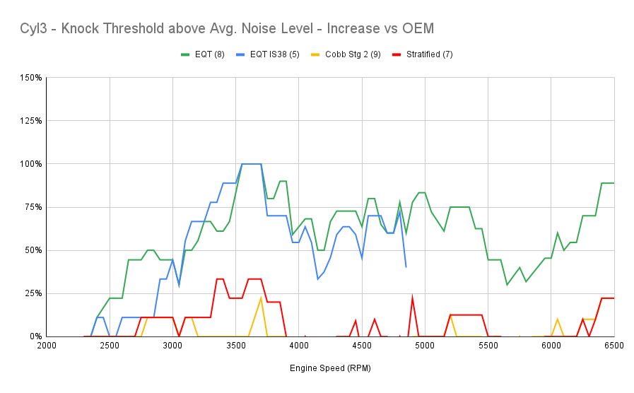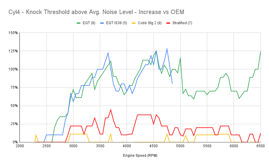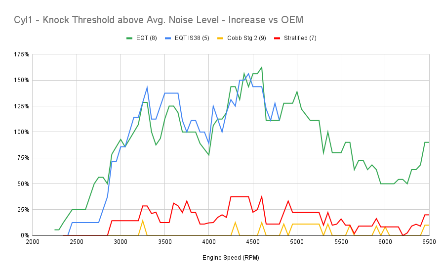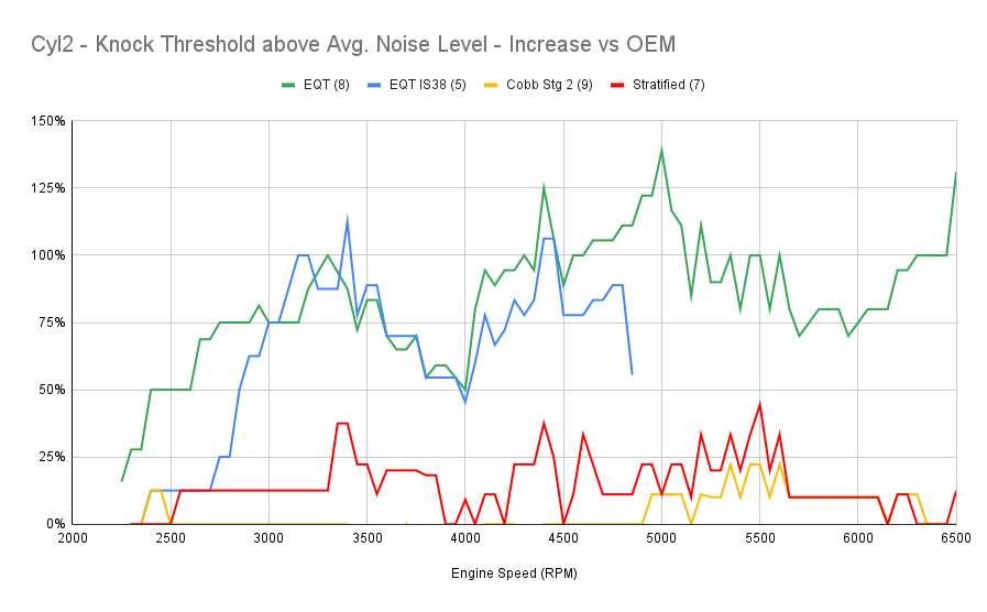 Taking a look at the increase in the knock threshold versus stock (EQT Noise Threshold over EQT Average Noise Level minus Stock Noise Threshold over Stock Average Noise Level divided by the stock reference), there are a couple of interesting results.
