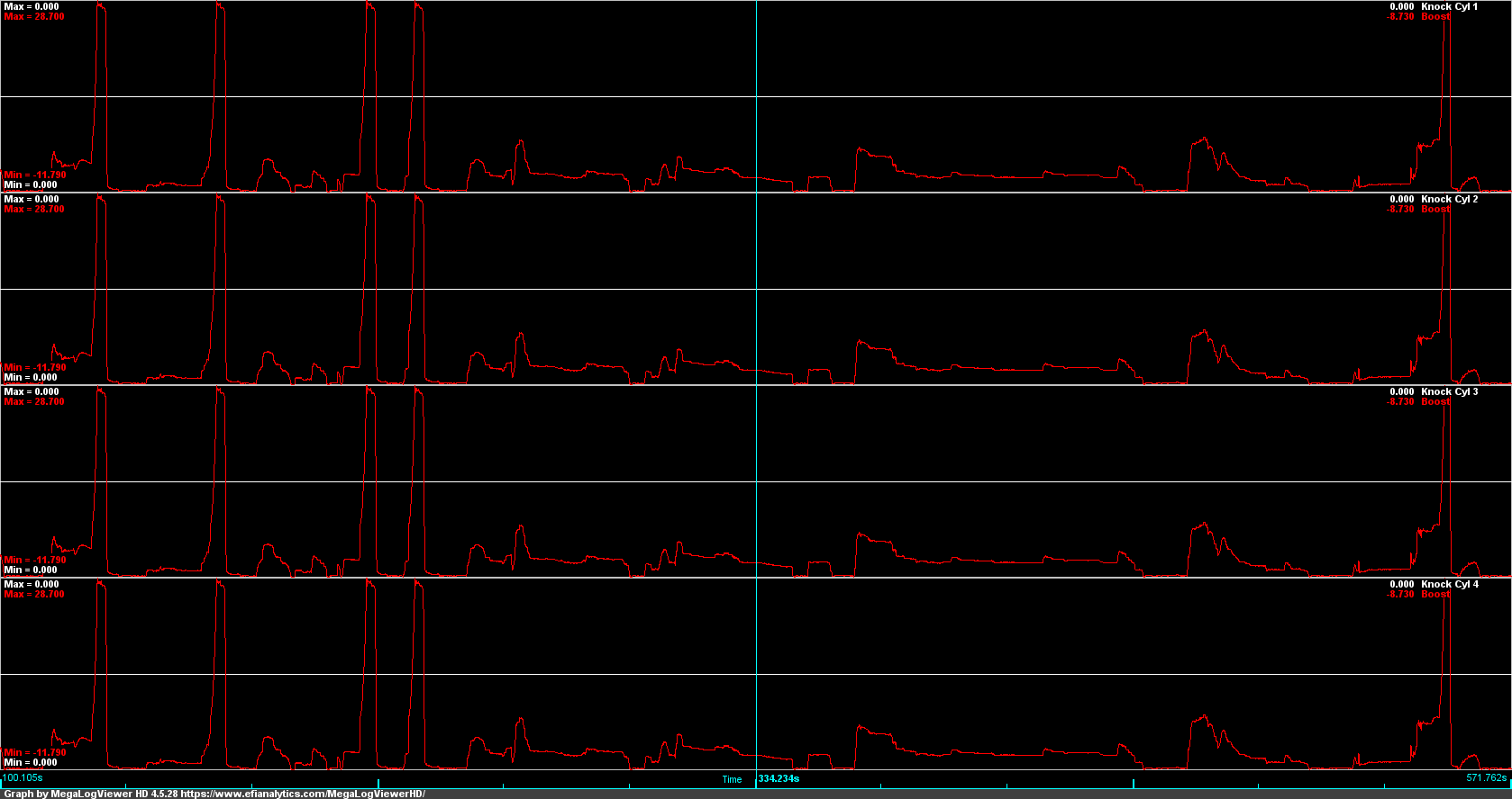During the IS38 custom-tuning, EQT did not communicate any changes to the knock sensor thresholds, so I installed the custom IS38 tune to log the knock sensors and related variables for evaluation.