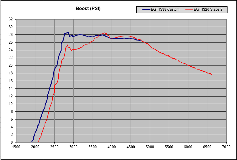 Up to almost 5,000 RPM, the boost curves are similar, with the IS38 tune holding more boost pressure below 3500 RPM – this looked promising.
