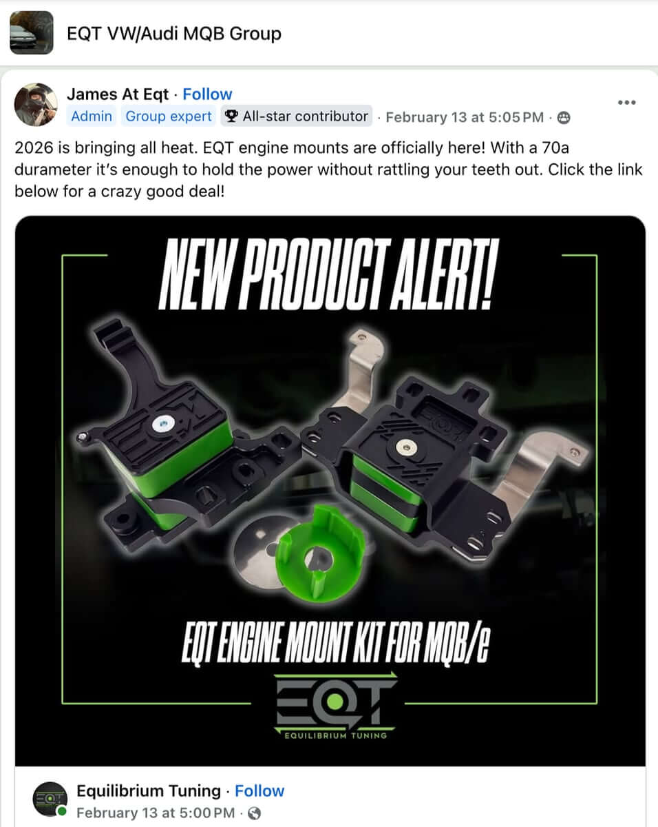 The Mk7 marketplace contains multiple competing engine and transmission mount products that solve the same engineering problem through visually distinct designs.