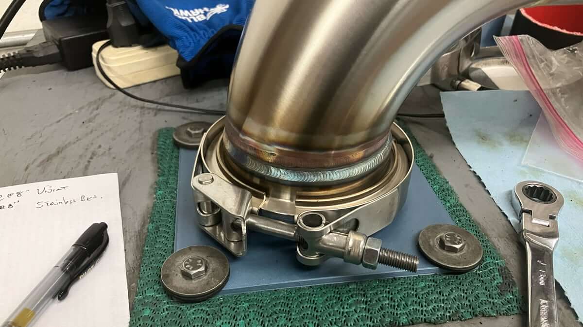 The bench adapter is used in conjunction with a V-band clamp to attach the midpipe to the flow bench.