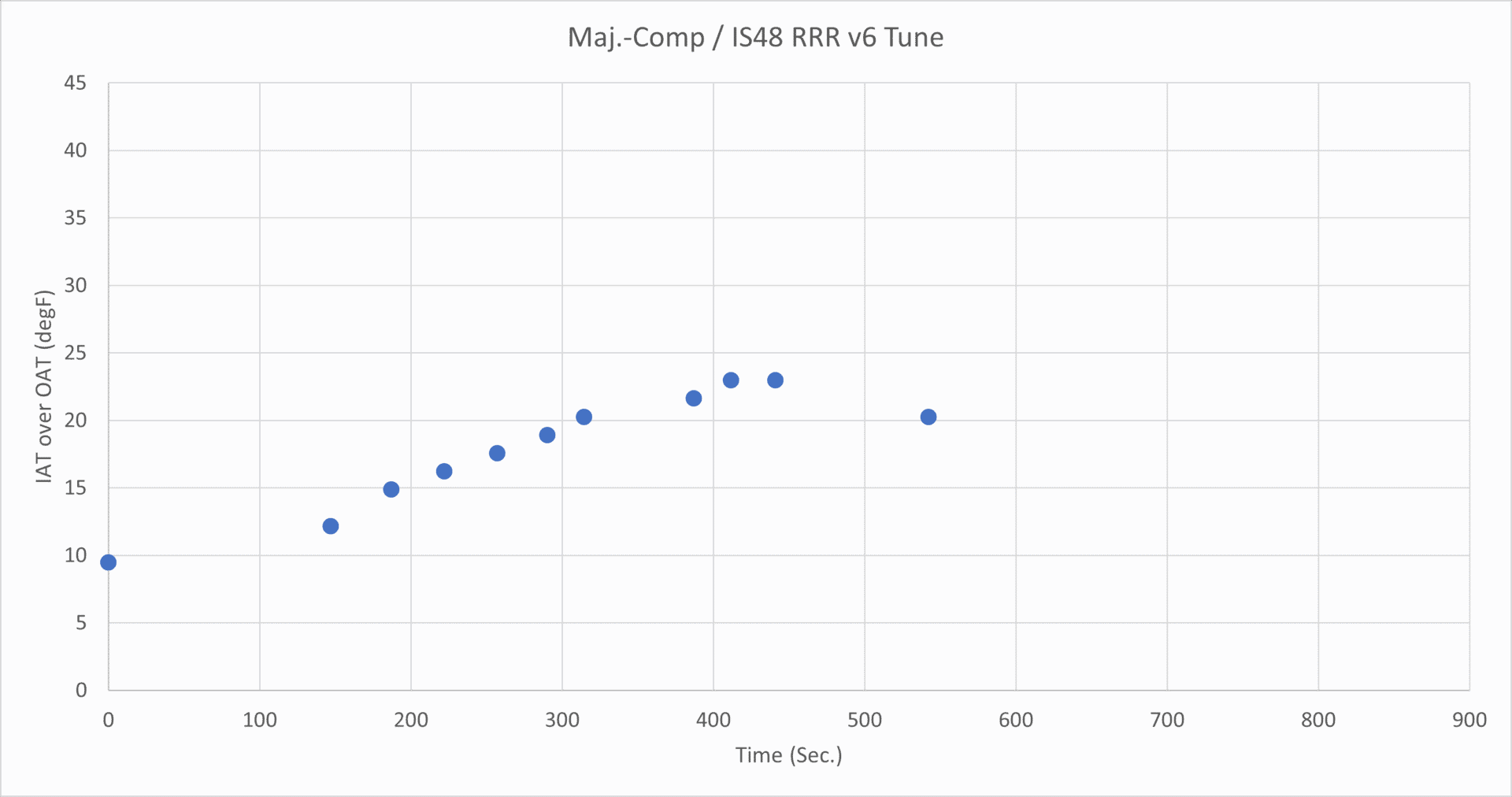 Pulls 9 and 10 plateaued near 22–23°F above ambient, suggesting the IC core was essentially at a point of stability where the heat rejection rate was equal to the heat addition rate. Recovery periods of 20–30 seconds between pulls did not meaningfully reduce IAT. A 95-second recovery before Pull 11 recovered about 3.1°F — partial, not full, recovery.