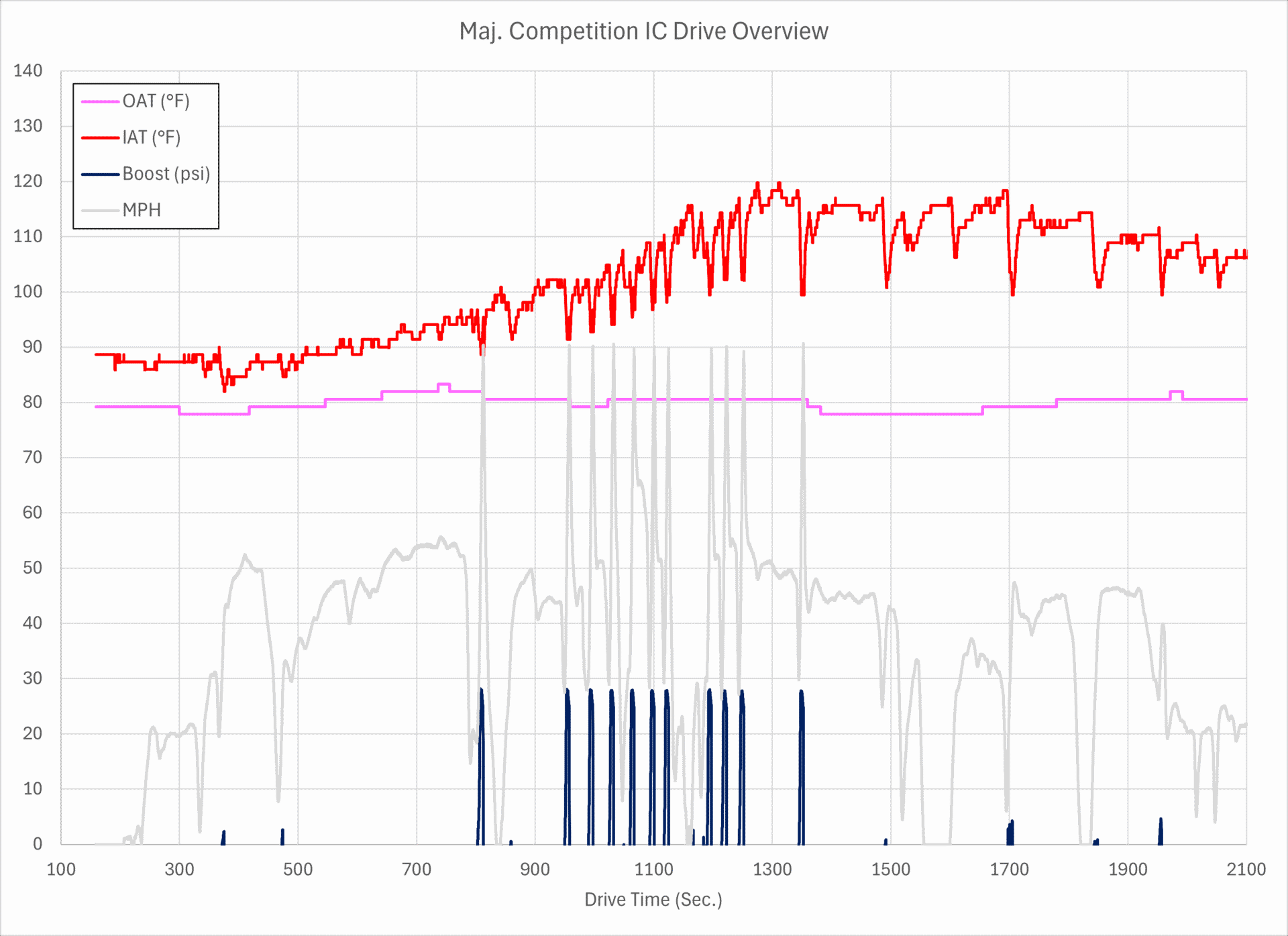 Pull 1 at 10°F above ambient averaged 0.440g longitudinal acceleration. Pulls 9 and 10 at 22–23°F above ambient averaged 0.435g. That’s a delta of 0.005g, or roughly 1.1% — statistically marginal. The IC accumulated 13°F of heat soak above the beginning state across nine minutes of back-to-back pulls, and measurable acceleration degraded by only 1.1%.