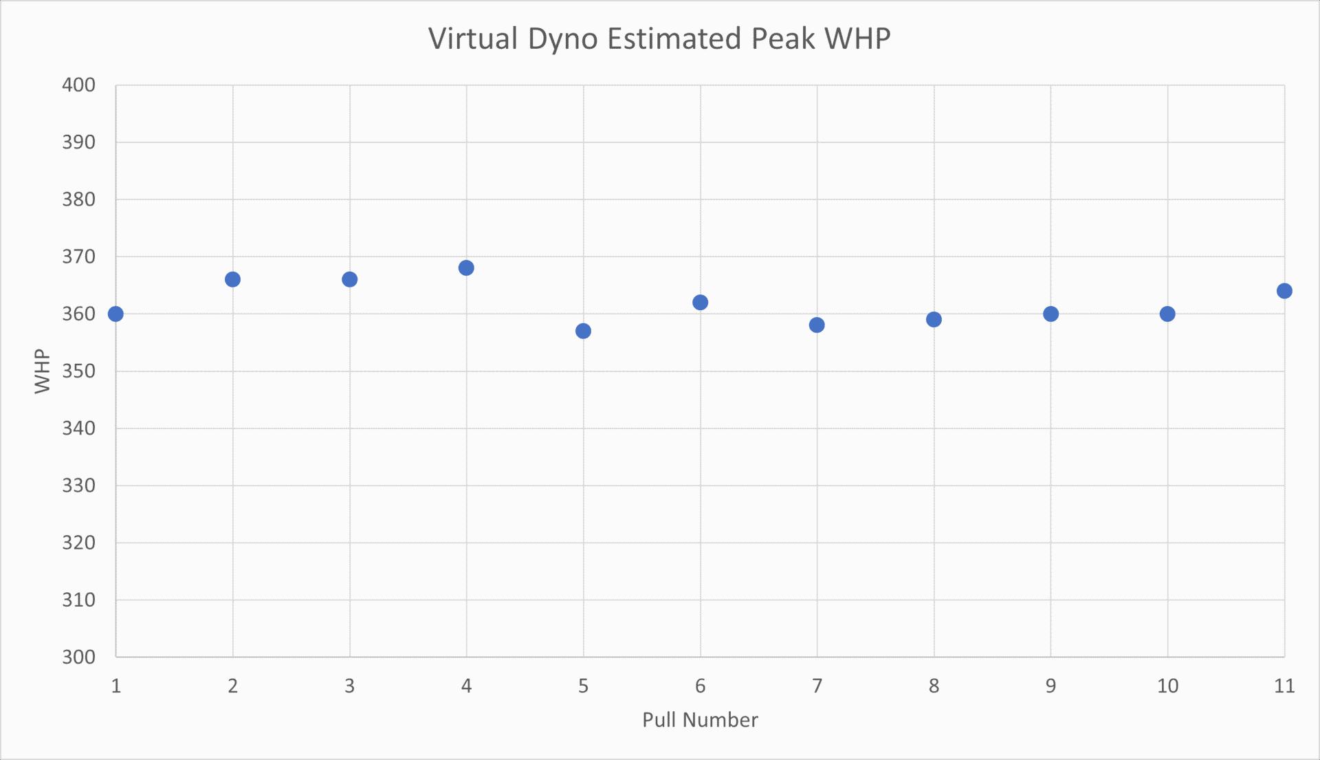 The Virtual Dyno estimated peak WHP varied within a 12 WHP window (357–369 WHP), with a standard deviation of only 3.7 WHP — consistent performance across all pulls, regardless of heat-soak state.