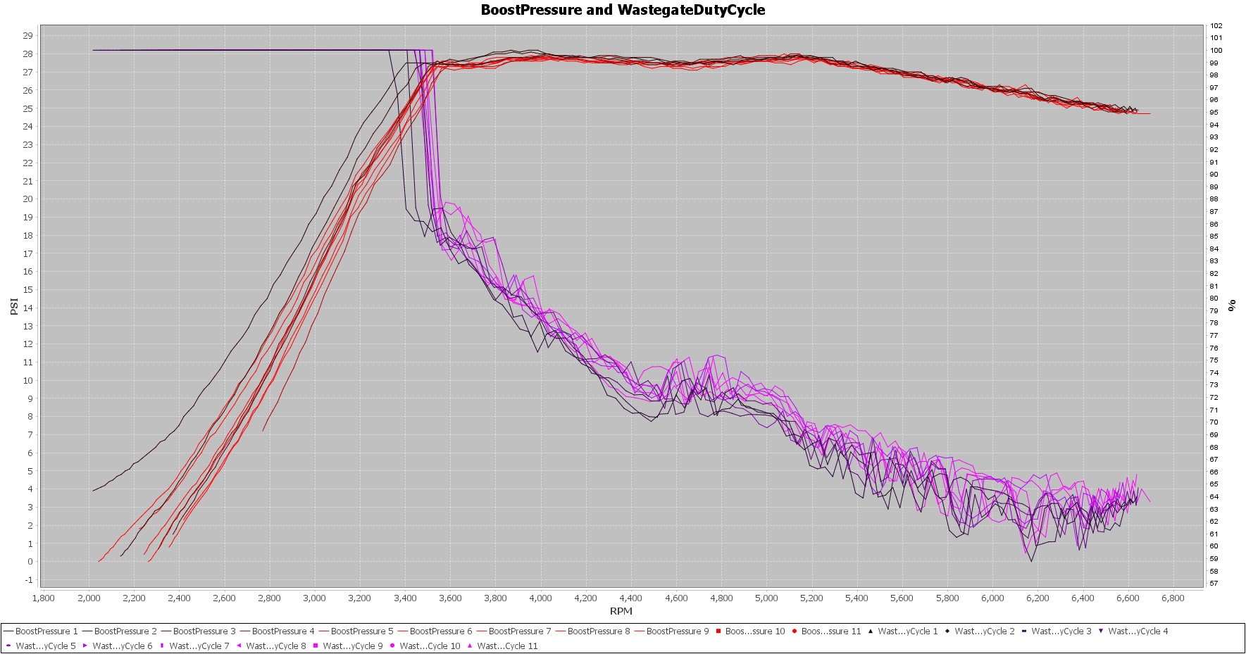 The boost pressure and wastegate duty cycle are shown in the next chart. Consistent with the flow test that showed the Competition IC has a relatively low pressure drop compared to other intercoolers tested, the wastegate duty cycle trends downward as engine speed increases.