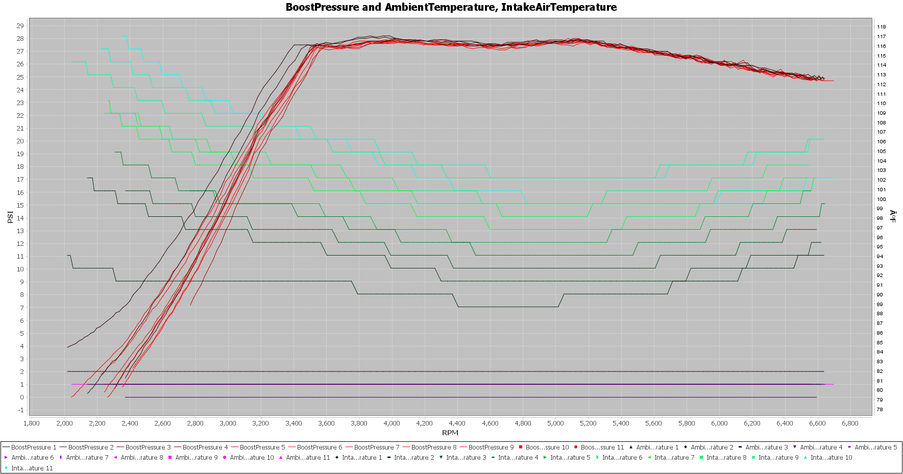 The session consisted of 11 WOT pulls over roughly nine minutes. By pull 9, the IAT had climbed to 23°F above ambient — more than double the beginning-state reading.
