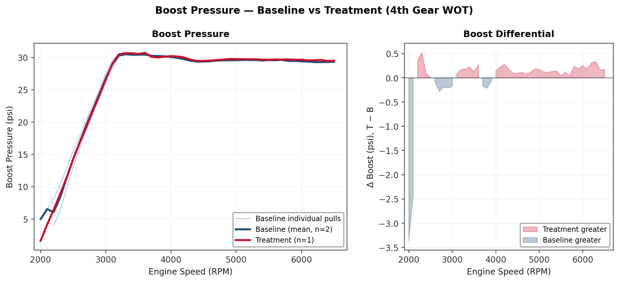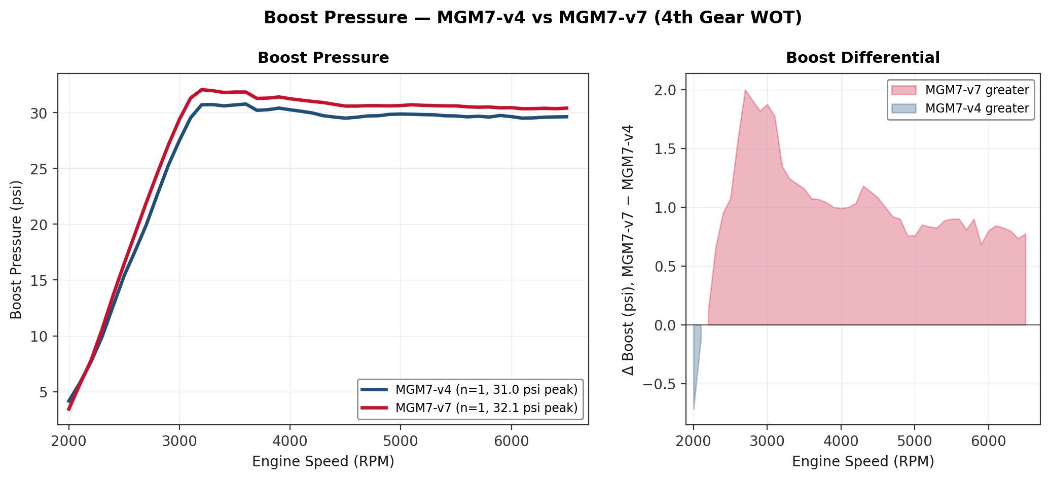 The boost pressure was raised approximately 1 psi, now holding around 30.4 psi through redline.