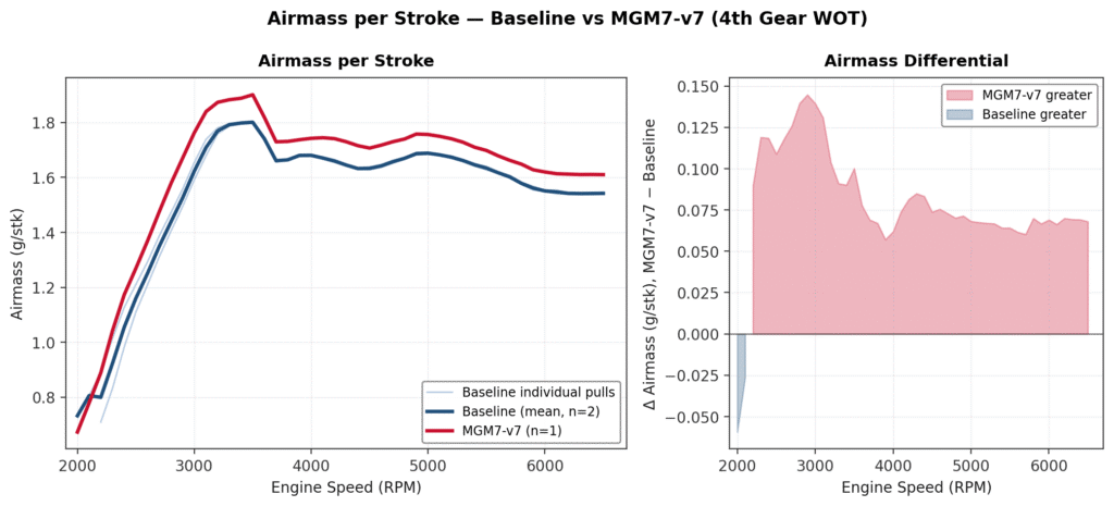 With the Airmass now sitting at the desired level of 1.6 g/stk at redline, shifting to optimizing power output will be the goal of the next tune revisions.