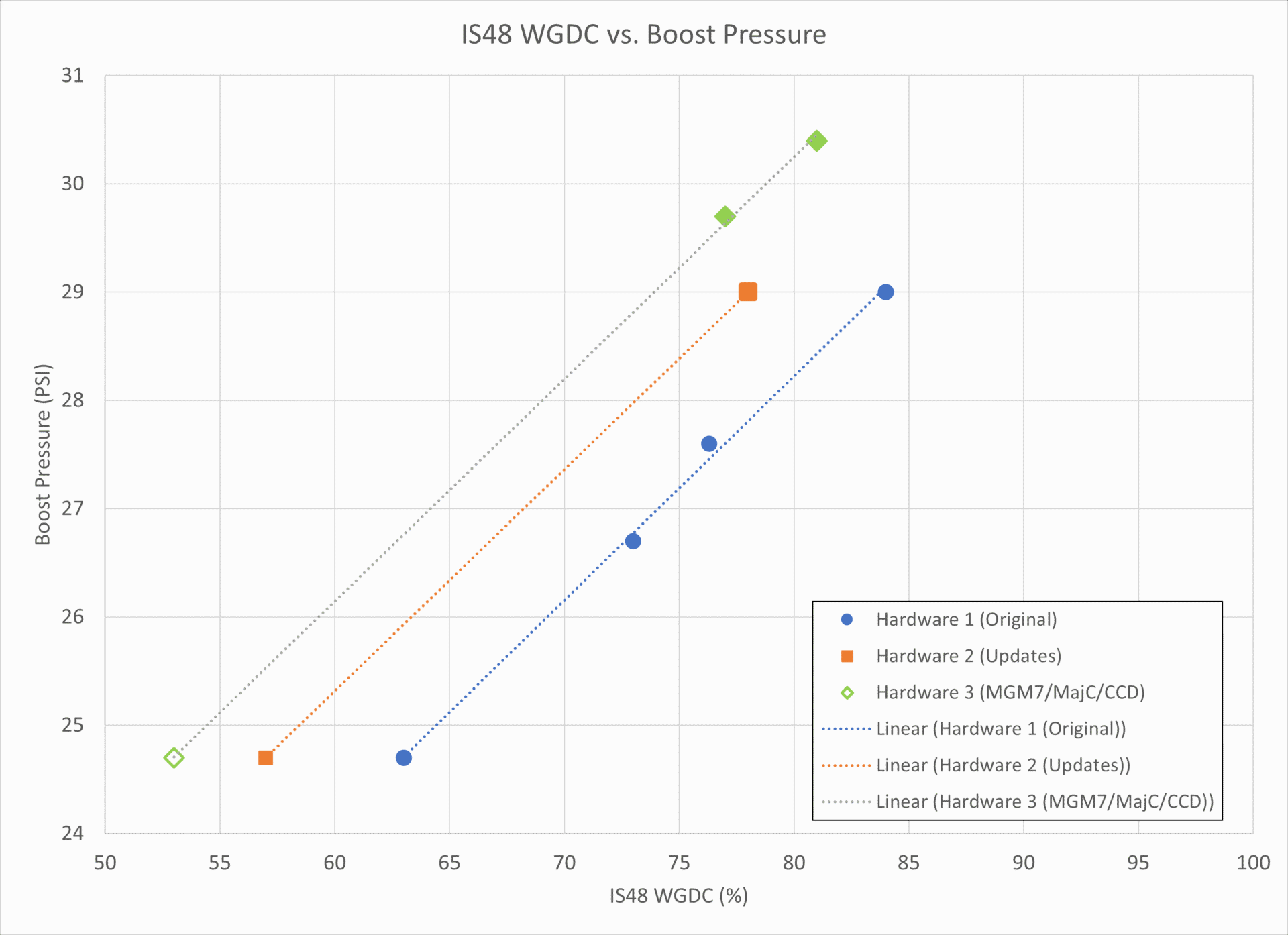 Last July, Russel Road and Racing provided me with a high-boost tune for the Shuenk IS48 turbocharger to gauge how close to the system limits I was operating. That E50 tune produced a boost pressure of 29.5 psi at redline at a wastegate duty cycle of 85%, which I felt was “enough“.